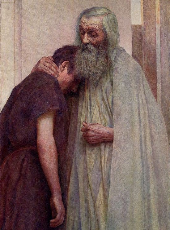 И что самое важное здесь? Это глубокая искренность покаяния, сознание, что я уже сыном не имею права называться. Я был жесток и неблагодарен, я расточил свое имение, не свое, а твое богатство, живя скверно. Во всем виноват я сам. Но я прошу тебя, прими меня в число твоих тружеников, наемников, и я буду честно работать тебе. Здесь происходит встреча отца и сына. Отец ждал его возвращения, и когда сын был еще далеко, он сам вышел ему навстречу, увидел его, и мил ему бысть, как сказано в притче, и пал ему на шею и целовал его. И здесь сын снова уже самому отцу говорит: я согрешил на небо и пред тобою, и уже недостоин называться сыном твоим. Отец сказал рабам своим: принесите первую одежду и оденьте его, и дайте перстень на руку его и обувь на ноги его. И приведите тельца упитанного и заколите его. Будем пировать и веселиться (Лк. 15, 23).