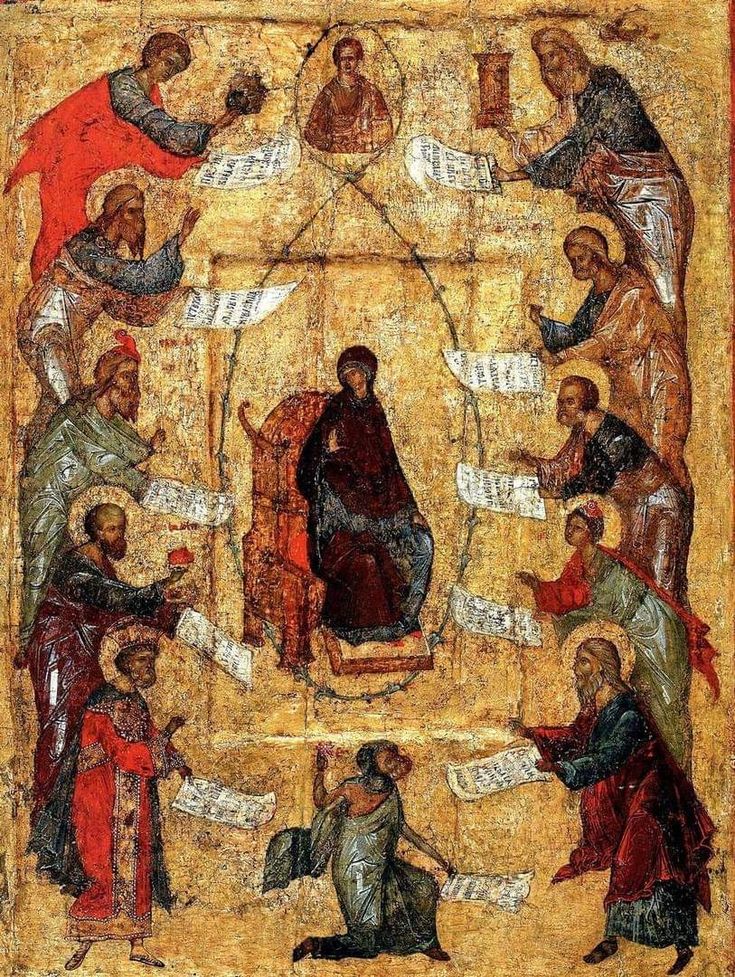 Царицу Небесную ныне хвалят пророки, ибо Она — исполнение всех пророчеств. Она — Лестница Небесная, Ею же сниде Бог, которую видел во сне Иаков. Она — Дева Пренепорочная, родившая нам Эммануила, еже есть сказаемо с нами Бог, как предсказал святой пророк Исаия. Ее прославляют ныне святые апостолы. Ее вели­чают святители и мученики. Ее ублажают преподобные и праведные.